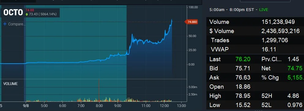 🚀 $OCTO exploded today!!! Up ~4,300%, surging from ~$1.45 to over $63 on massive volume!